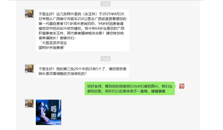 抱着一线希望,朱玉林先生前往郑州吃中药,在服用袁希福院长开具的两个疗程中药后,他感觉到病情大为减轻,后续复查结果显示肿瘤缩小了6厘米。在第三个疗程期间,8月26日他亲自驾车250公里,前往广西武宣县探望了百岁老人梁米贵。
