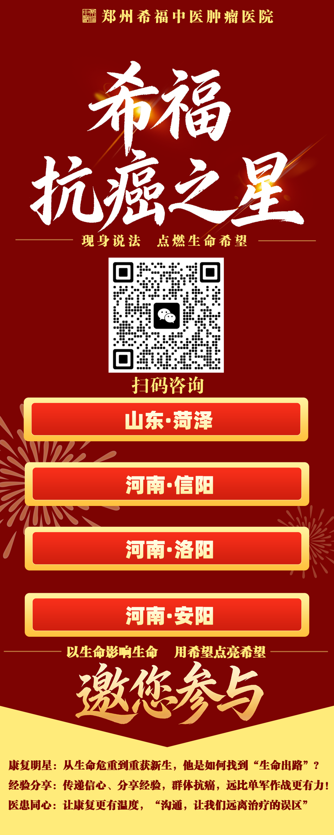 最后,2026年4月27日(周一)“郑州市非物质文化遗产-袁氏中医肿瘤疗法”传承人-袁希福院长将照常坐诊,将继续以专业的医术和仁爱之心,为每一位癌友的健康保驾护航。