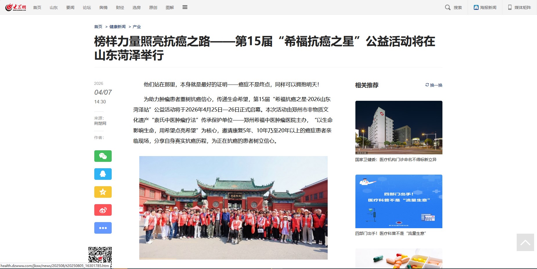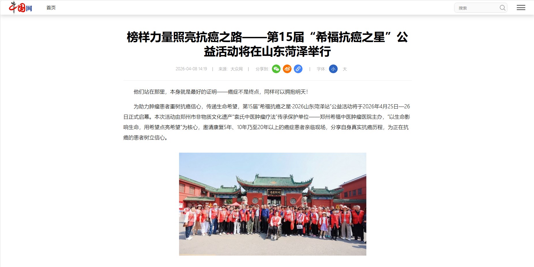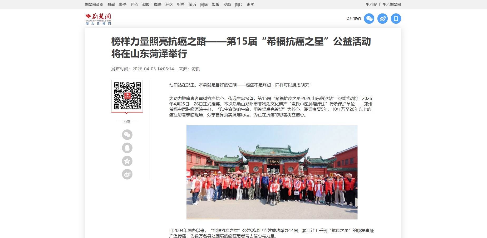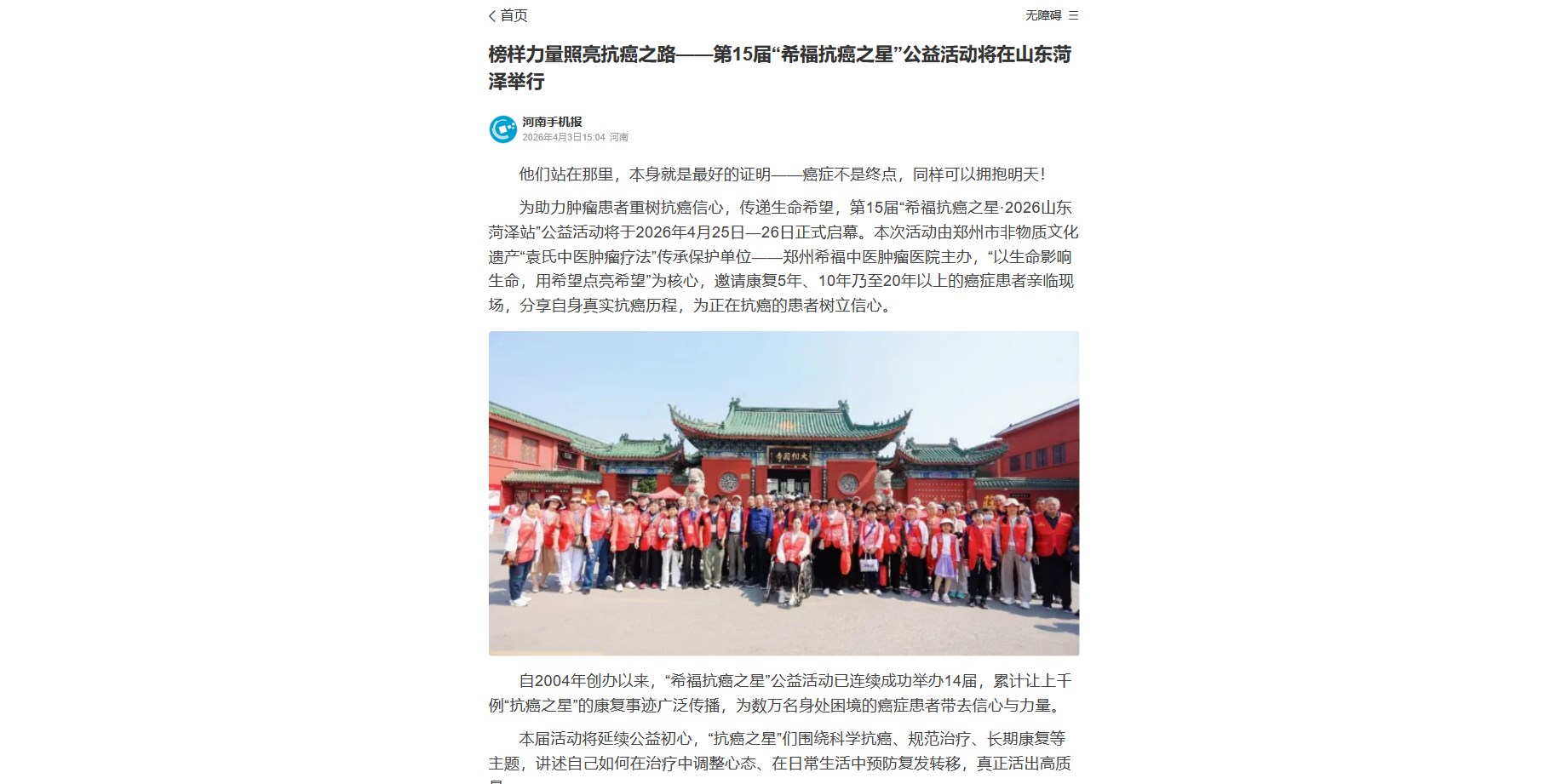 为助力肿瘤患者重树抗癌信心,传递生命希望,第15届“希福抗癌之星·2026山东菏泽站”公益活动将于2026年4月25日—26日正式启幕。本次活动由郑州市非物质文化遗产“袁氏中医肿瘤疗法”传承保护单位——郑州希福中医肿瘤医院主办,“以生命影响生命,用希望点亮希望”为核心,邀请康复5年、10年乃至20年以上的癌症患者亲临现场,分享自身真实抗癌历程,为正在抗癌的患者树立信心。
